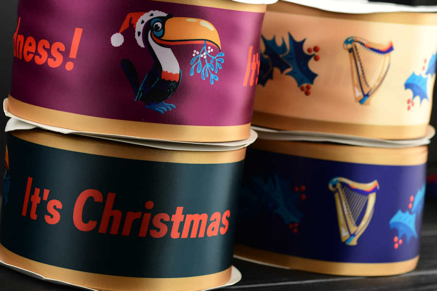 The gift ribbons are printed on satin ribbon material in full color on both sides. The full-color printed gift ribbon is printed from both sides, and the material has semi-matt finish on both sides.