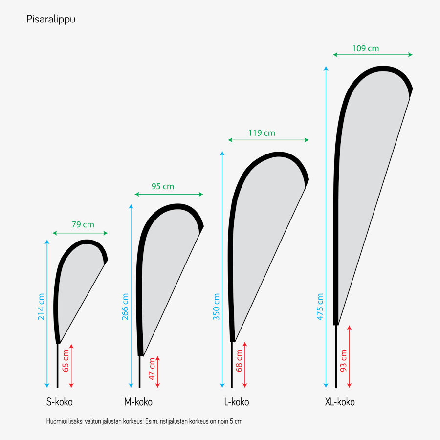 All flags include full-color printing on one side of the material, and a negative image is projected on the opposing side.