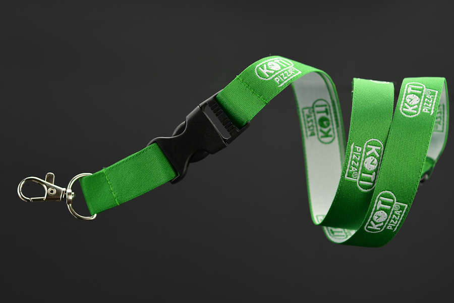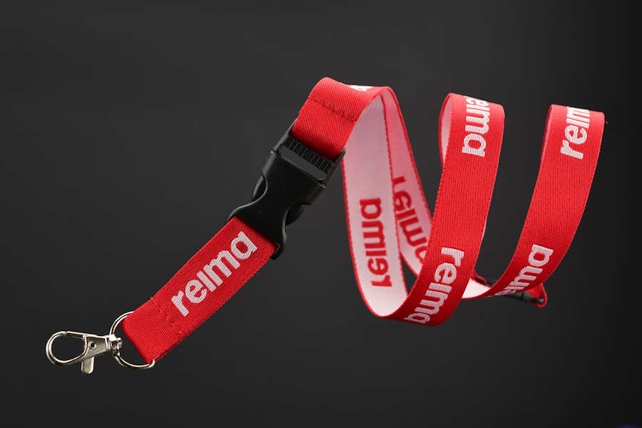 The lanyard is woven flat to the desired width using colored threads. The lanyard always has at least 2 different yarn colors to form the desired base color and a logo in its basic form. On the back of the lanyard, the design is reversed in contrasting colors.
